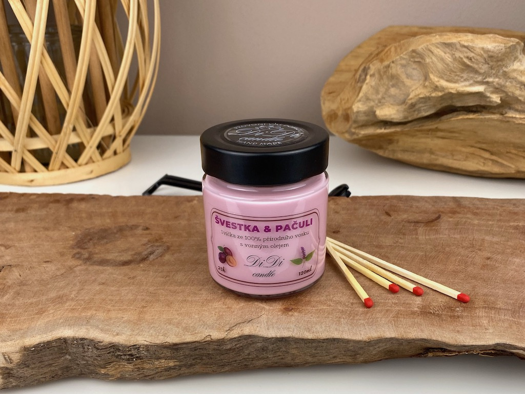Svíčka s vonným olejem s vůní švestky, růže a patchouli 120 ml
